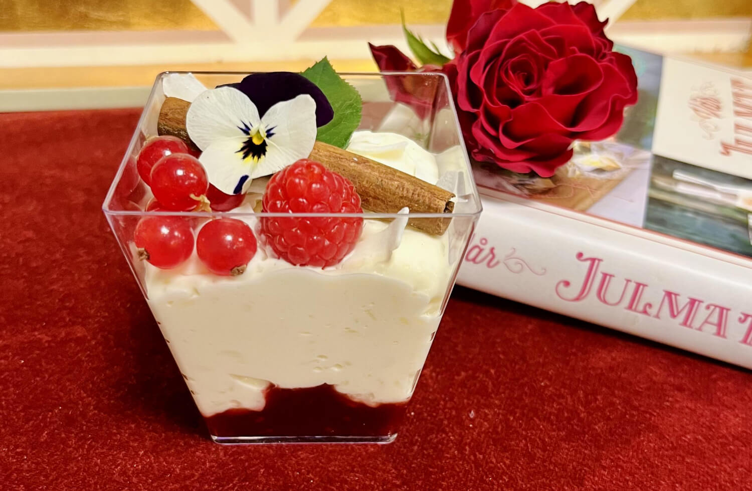 Deilig riskrem på Arborioris og Røroskrem med bringebærsaus, ristet og skivet mandel samt bringebærknopp.