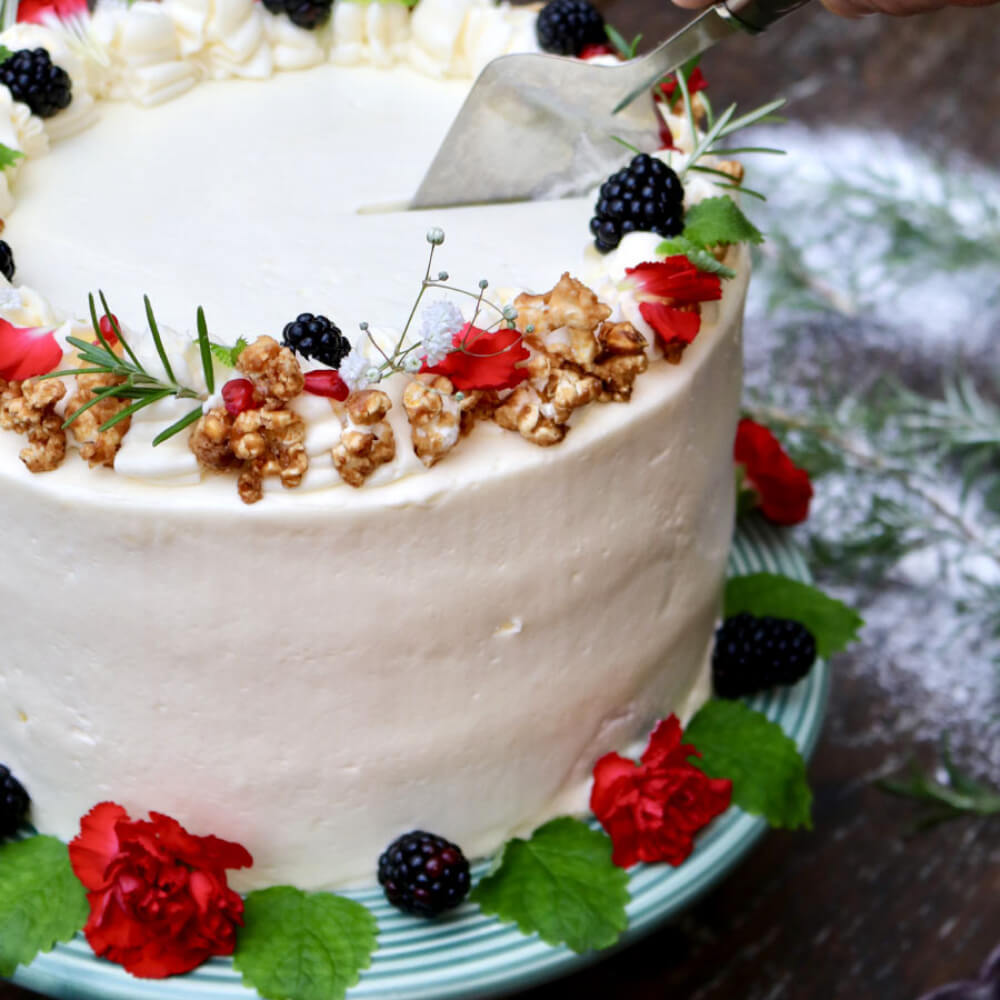 Julens tre-lags “kryddtårta” med karamellfudge, hvit frosting, karamelliserte popcorn og nydelig juledekor