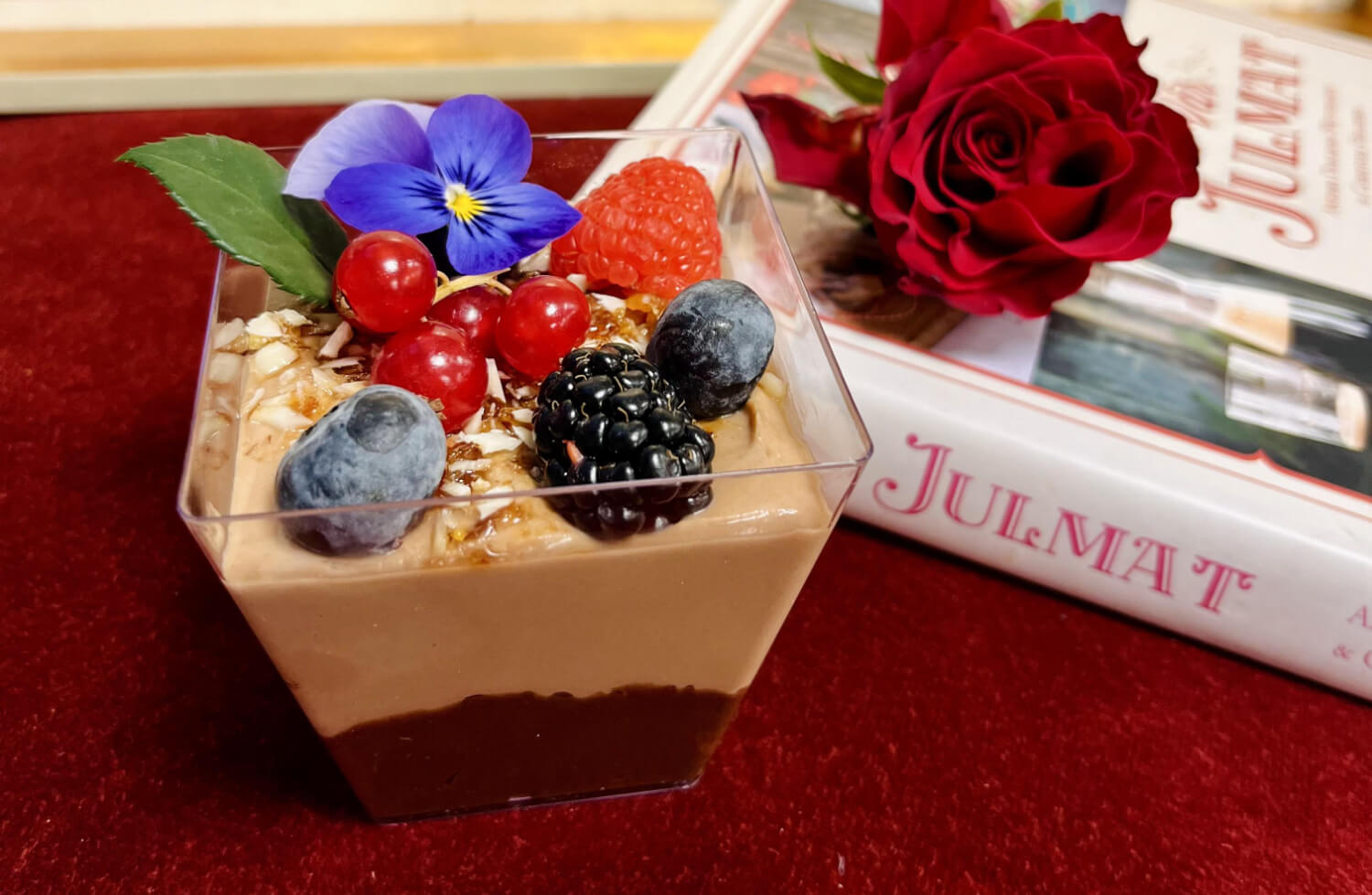 Fluffy jule-sjokolademousse smaksatt med kanel og cognac, som toppes med crunchy krokan og pyntes med bjørnebær og julekaken: mandelspon.
