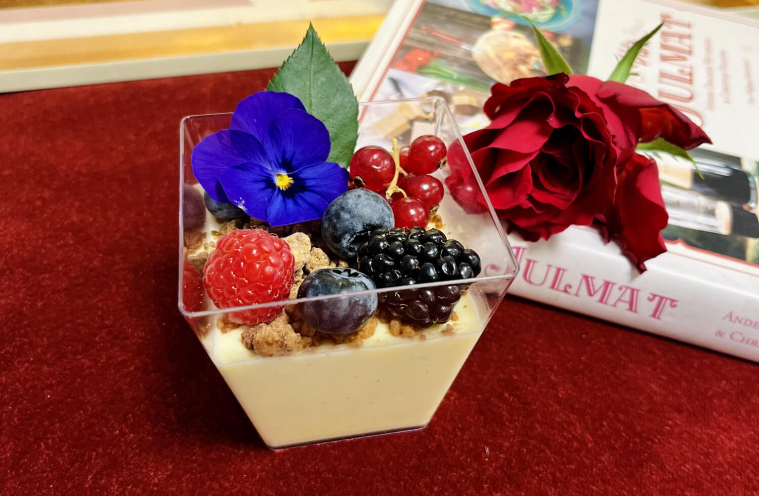 Myk Italiensk vanilje og kanel panna cotta med karamellisert hvit sjokolade,