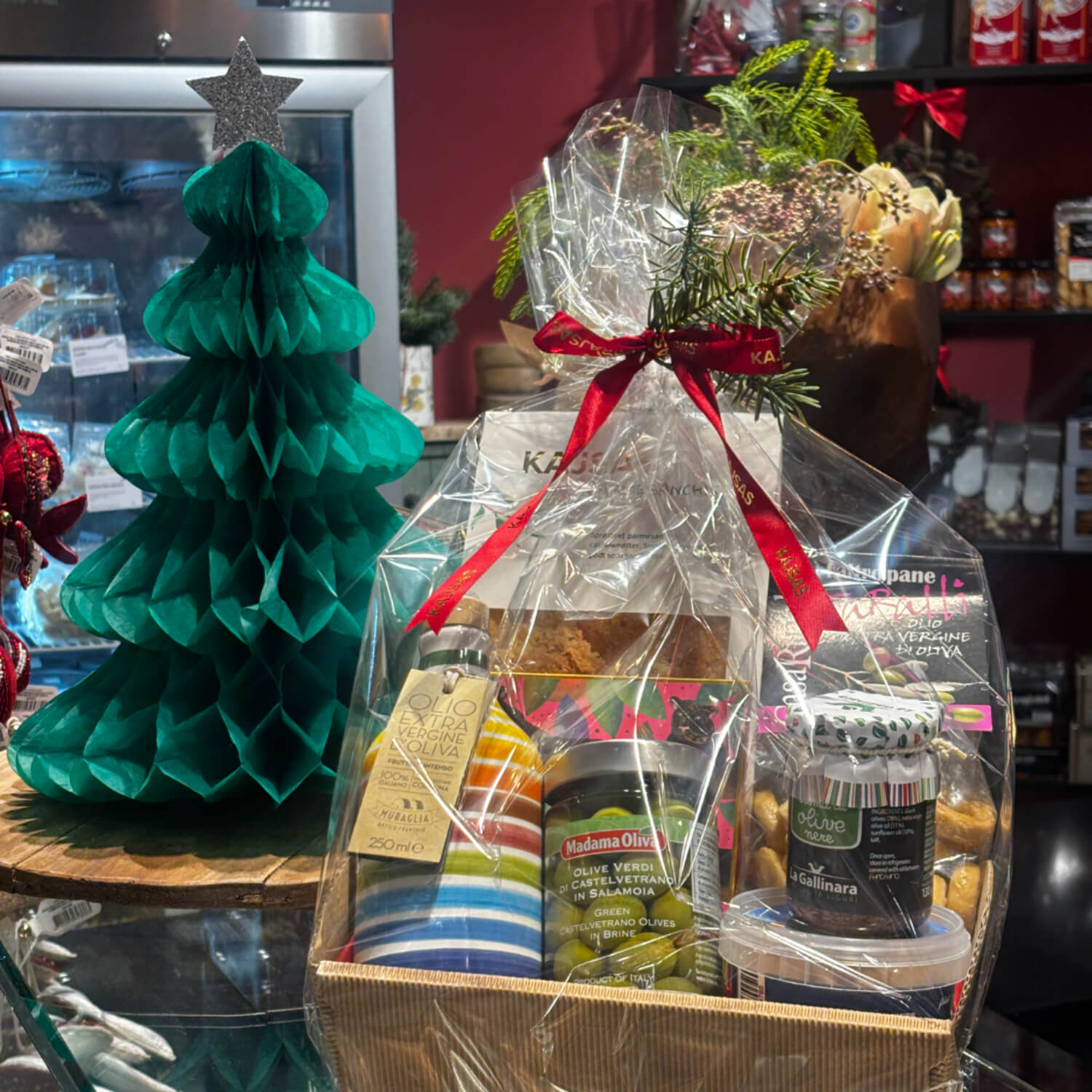 En perfekt gave til matelskeren! Her får du fantastiske varer av beste kvalitet: Muraglia Keramikkflaske med Extra virgin olivenolje, Kajsas Parmesanchips, Tarelli kjeks, supergode italenske oliven, Marcona mandler, Oliven tappenade og en nydelig sjokoladeplate fra Tufto.